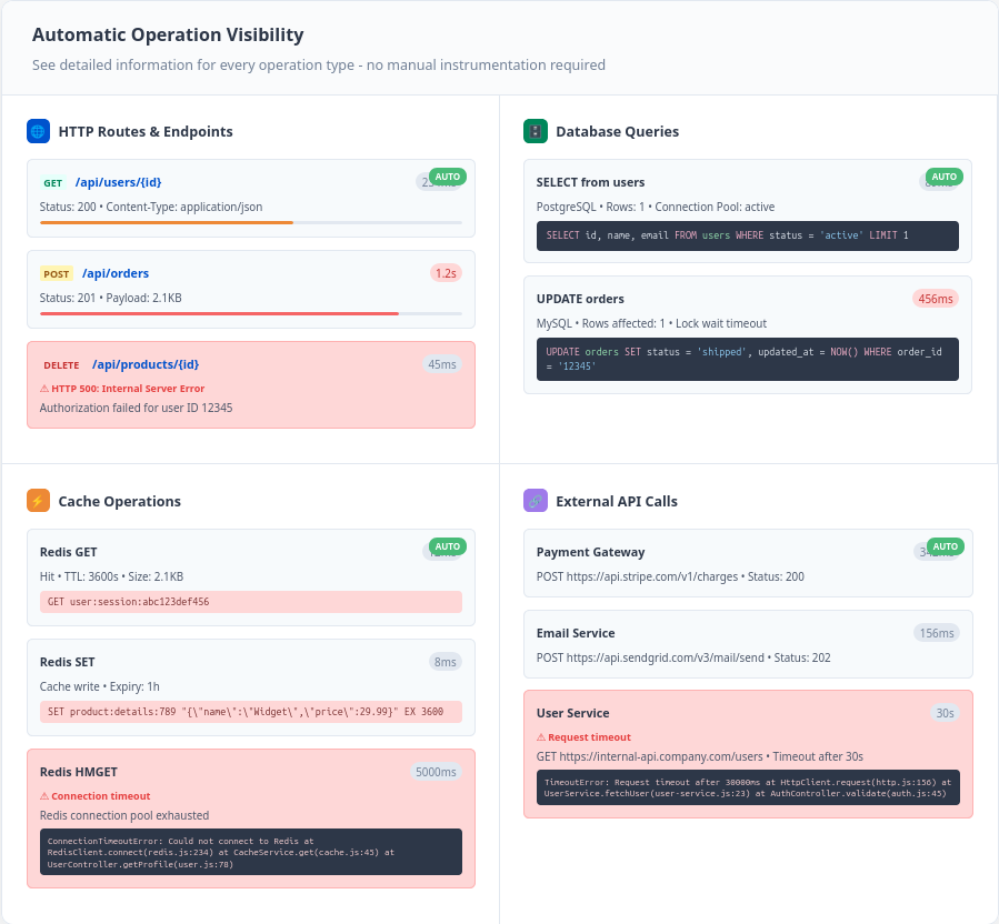 See HTTP routes, database queries, Redis/Memcached operations, and external API calls automatically. Identify slow database queries with parameterized SQL statements, track Redis commands, and see which endpoints have high latency. Error spans include stack traces showing where exceptions occurred. Learn more about trace details.