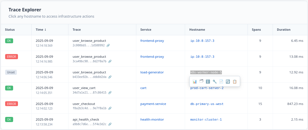 Click on any hostname or Kubernetes node in your trace to access a quick action menu. Jump directly to related metrics, logs, or events for that resource. Navigate from traces to infrastructure data without manual filtering or copy-pasting identifiers. Learn more about trace explorer.