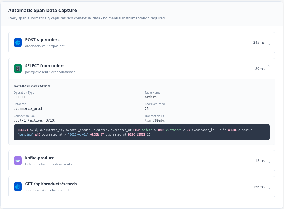 Every span captures HTTP headers, status codes, request/response sizes automatically. Database spans include sanitized SQL queries, table names, and operation types. Message queue spans show topic names, partition IDs, and message counts. Learn more about span attributes.