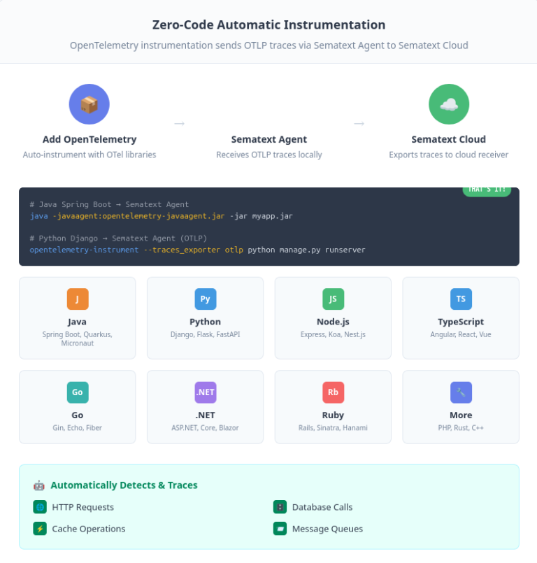 Automatic instrumentation for Java, Python, Node.js, TypeScript, Go, .NET, and Ruby. Zero code changes required with OpenTelemetry auto-instrumentation. Traces HTTP requests, database calls, cache operations, and message queues automatically. Supports Spring Boot, Django, Express, Rails, and other popular frameworks out of the box. Learn more about SDKs.