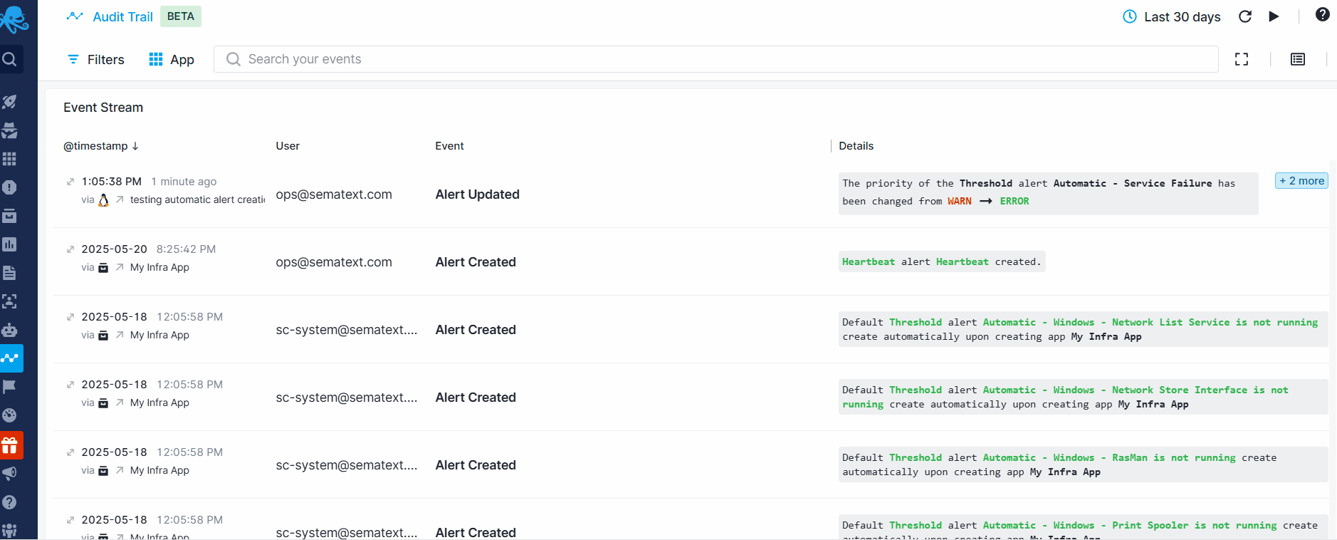 Every time a user makes a change, an event is recorded in the Audit Trail. In addition to tracking manual user actions, Audit Trail also tracks certain changes that are automatically made by the Sematext system to help with the setup and configuration. For example, when you create a new App, we automatically create default alert rules tailored to the selected integration type. These defaults are designed to help you start monitoring key metrics and logs with minimal setup. These system-initiated actions appear in the Audit Trail with the user listed as sc-system@sematext.com.
